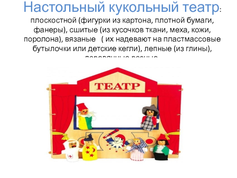 Слайд 6Настольный кукольный театр: плоскостной (фигурки из картона, плотной бумаги, фанеры), сшитые