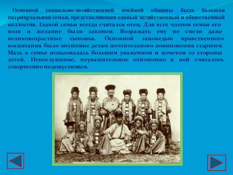 Слайд 6Основной социально-хозяйственной ячейкой общины была большая патриархальная семья, представляющая единый хозяйственный