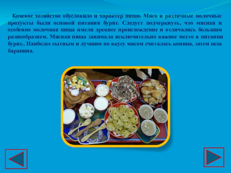 были основой питания бурят. Следует подчеркнуть, что мясная и особенно молочная пища имели древнее происхождение и отличались большим разнообразием. Мясная пища занимала исключительно важное место в питании бурят.. Наиболее сытным и лучшим по вкусу мясом считалась конина, затем шла баранина.
