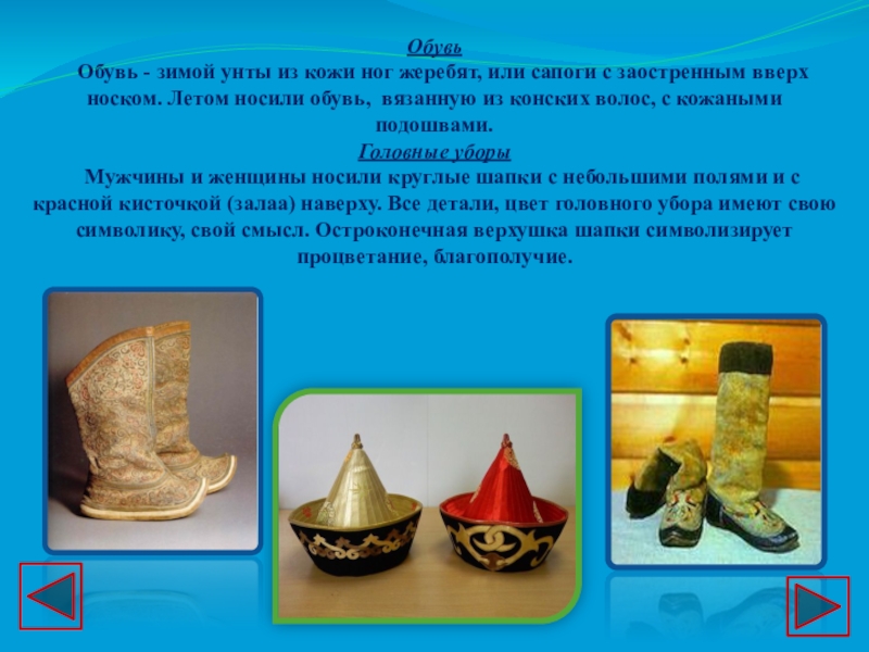 заостренным вверх носком. Летом носили обувь, вязанную из конских волос, с кожаными подошвами.