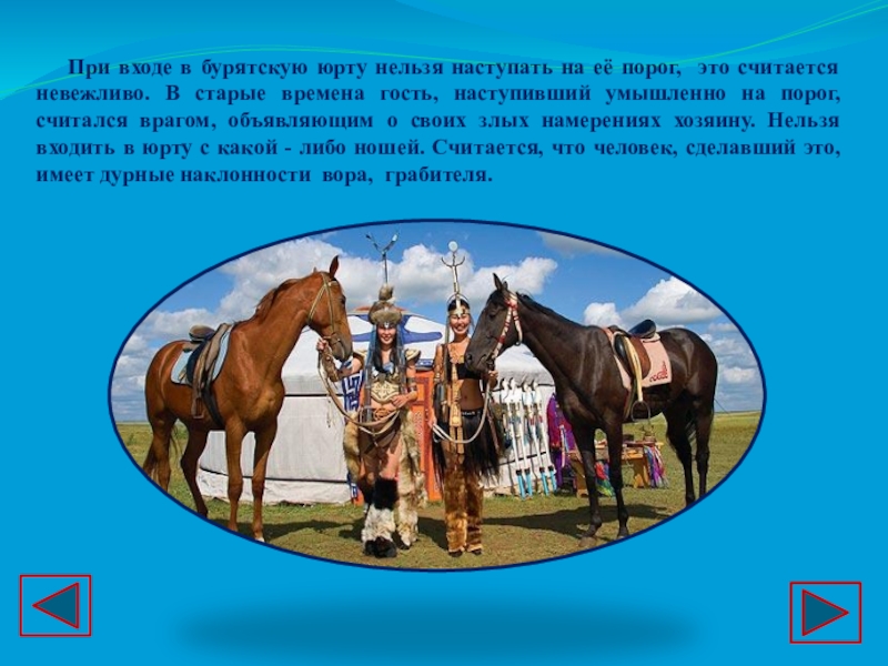 Слайд 8 При входе в бурятскую юрту нельзя наступать на её