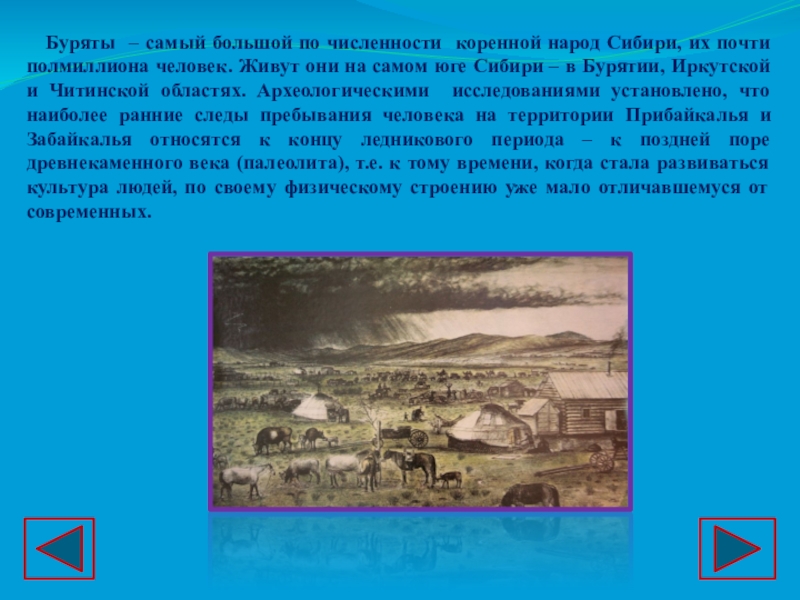 почти полмиллиона человек. Живут они на самом юге Сибири – в Бурятии, Иркутской и Читинской областях. Археологическими исследованиями установлено, что наиболее ранние следы пребывания человека на территории Прибайкалья и Забайкалья относятся к концу ледникового периода – к поздней поре древнекаменного века (палеолита), т.е. к тому времени, когда стала развиваться культура людей, по своему физическому строению уже мало отличавшемуся от современных.