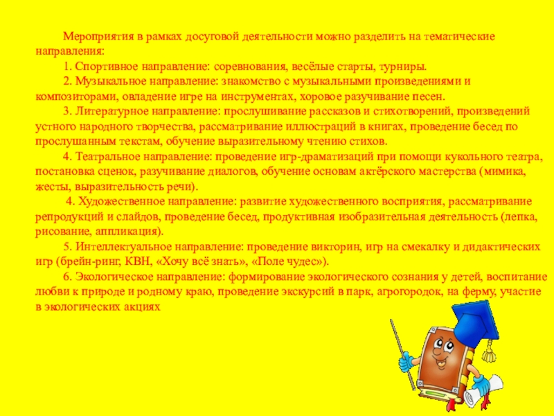 Слайд 7Мероприятия в рамках досуговой деятельности можно разделить на тематические направления: