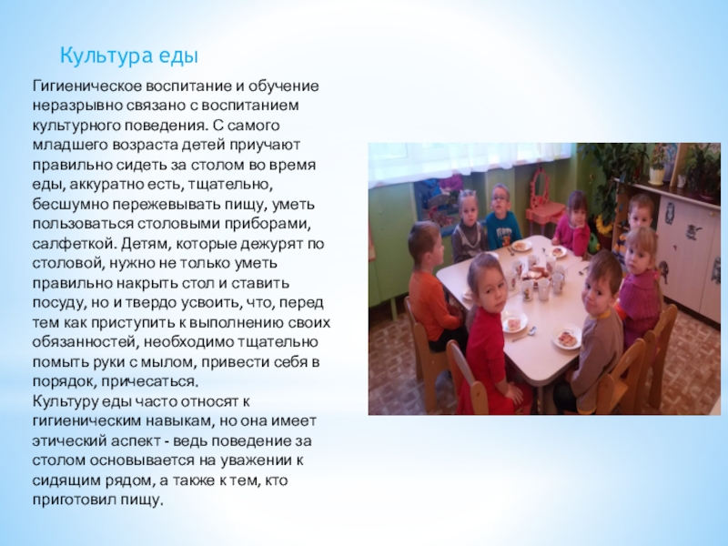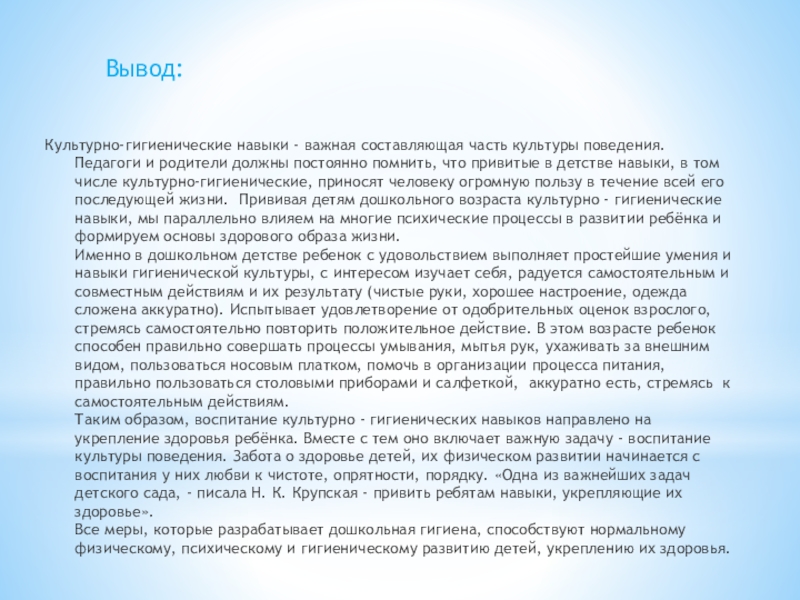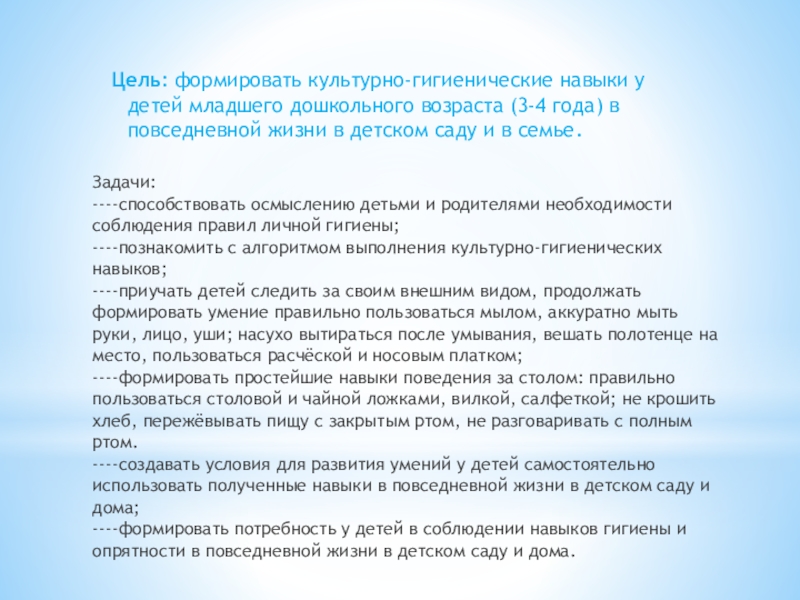 Цель: формировать культурно-гигиенические навыки у детей младшего дошкольного возраста (3-4 года) в повседневной жизни в детском саду и в семье.
