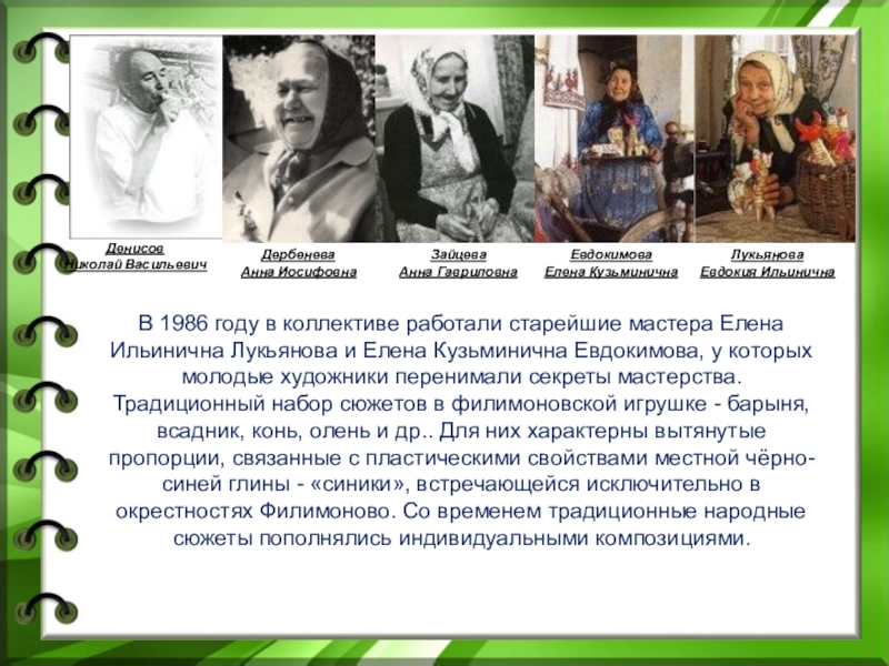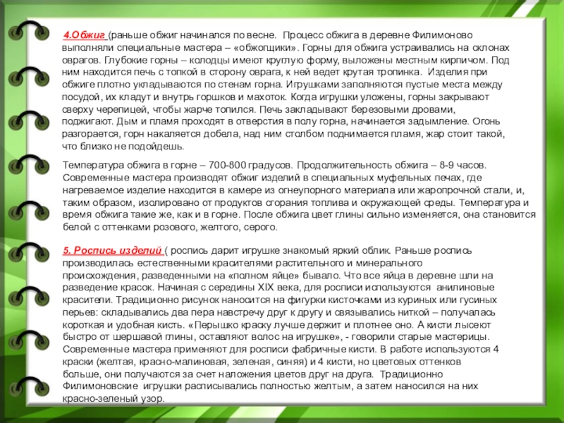 4.Обжиг (раньше обжиг начинался по весне. Процесс обжига в деревне Филимоново выполняли специальные мастера – «обжогщики». Горны для обжига устраивались на склонах оврагов. Глубокие горны – колодцы имеют круглую форму, выложены местным кирпичом. Под ним находится печь с топкой в сторону оврага, к ней ведет крутая тропинка. Изделия при обжиге плотно укладываются по стенам горна. Игрушками заполняются пустые места между посудой, их кладут и внутрь горшков и махоток. Когда игрушки уложены, горны закрывают сверху черепицей, чтобы жарче топился. Печь закладывают березовыми дровами, поджигают. Дым и пламя проходят в отверстия в полу горна, начинается задымление. Огонь разгорается, горн накаляется добела, над ним столбом поднимается пламя, жар стоит такой, что близко не подойдешь.