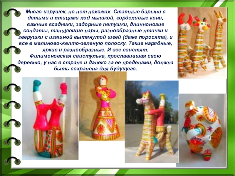 Кофты у барынь и рубахи у солдат филимоновской игрушки обычно окрашены одним цветом: красным, зеленым, желтым. Но сколько выдумки появляется у мастериц, когда они рисуют орнамент на юбках, передниках и штанах у своих кукол! Только лица у игрушек остаются чисто белыми, лишь точки – глаза, пятнышки – рот.