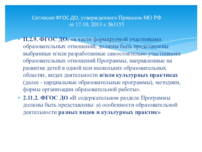 П.2.9. ФГОС ДО: «в части формируемой участниками образовательных отношений, должны быть представлены выбранные и/или разработанные самостоятельно участниками образовательных отношений Программы, направленные на развитие детей в одной или нескольких образовательных областях, видах деятельности и/или культурных практиках (далее - парциальные образовательные программы), методики, формы организации образовательной работы».