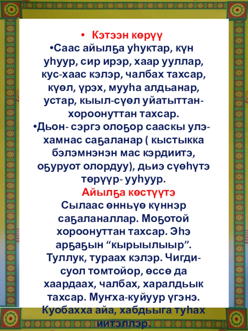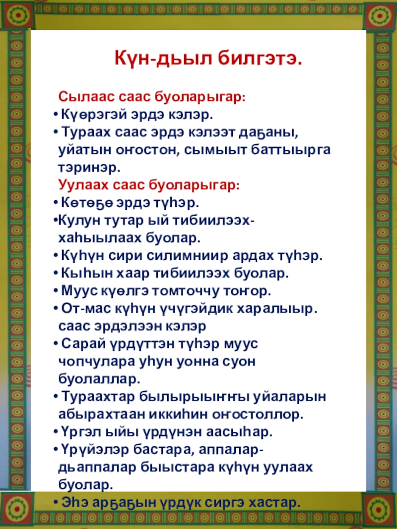 Сахалар биэ төрүө балтараа- икки ый иннинэ кулунун арааран, уулаах биэни сынньатар үгэстээхтэр. Сааскы бастакы ый ол иһин кулун тутар диэн ааттаммыт.