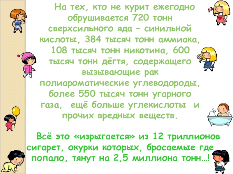 Слайд 16 На тех, кто не курит ежегодно обрушивается 720 тонн
