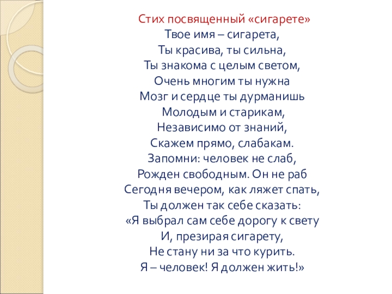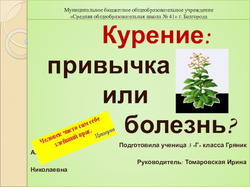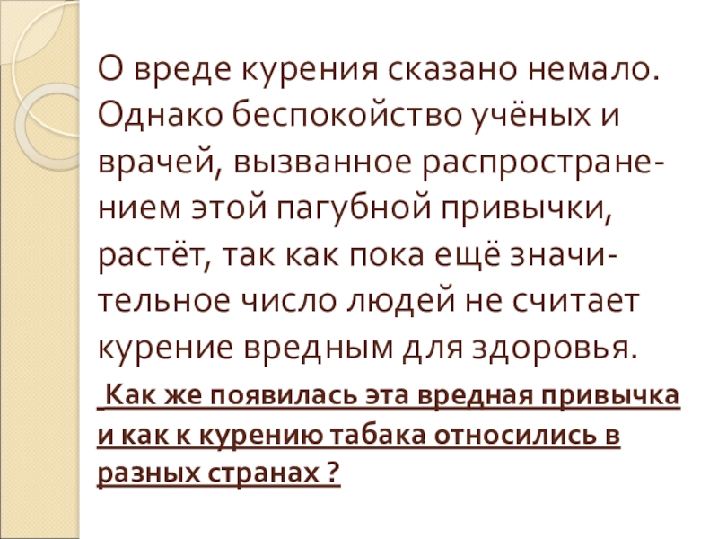 этой пагубной привычки, растёт, так как пока ещё значи-тельное число людей не считает курение вредным для здоровья.