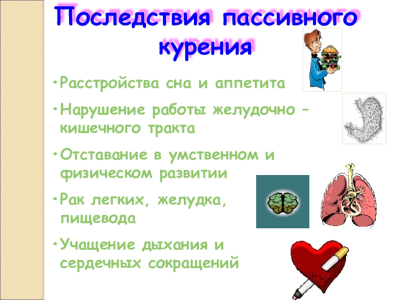 риск того, что ребёнок заболеет астмой, сердечно – сосудистыми заболеваниями, будет чаще болеть респираторными заболеваниями, кариесом.