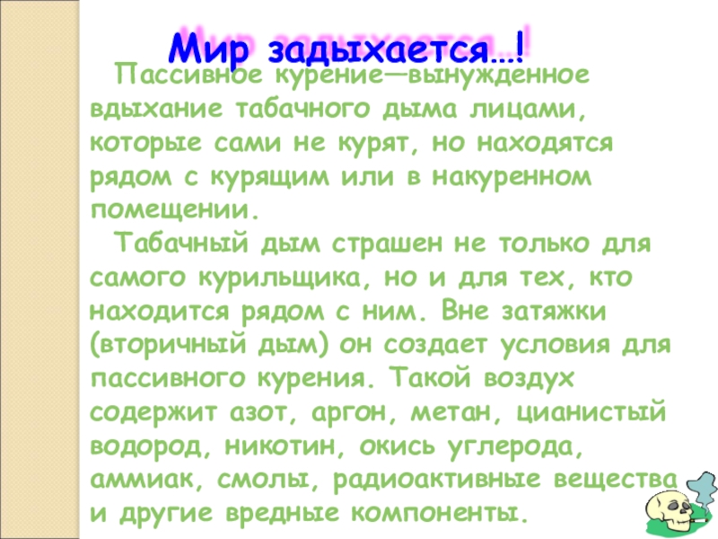 Пассивное курение—вынужденное вдыхание табачного дыма лицами, которые сами не