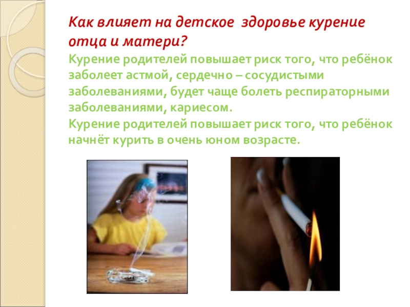 Слайд 10Как влияет на детское здоровье курение отца и матери?