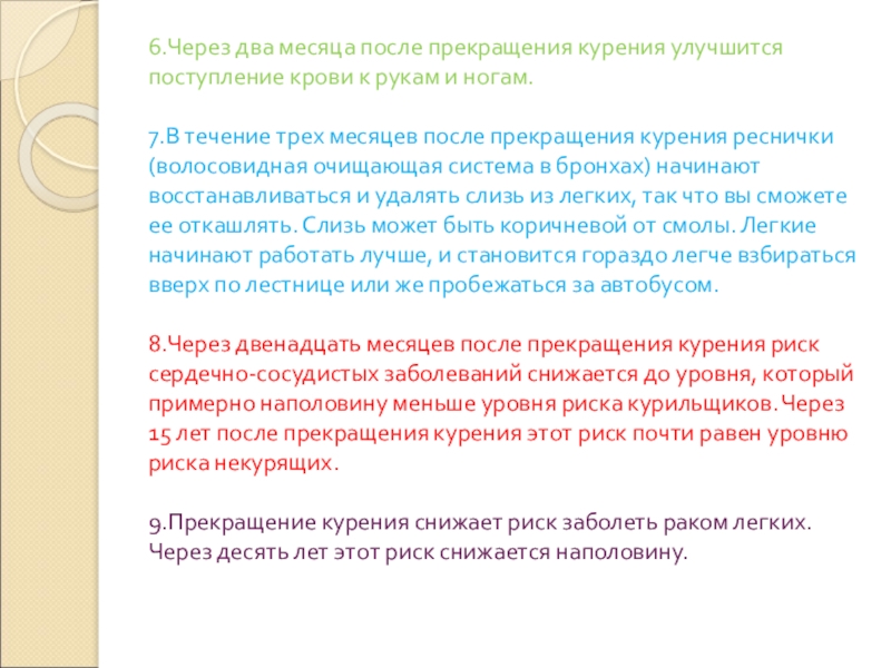 Слайд 196.Через два месяца после прекращения курения улучшится поступление крови к рукам