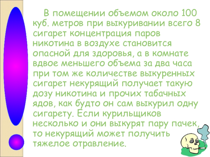 Слайд 13 В помещении объемом около 100 куб. метров при выкуривании