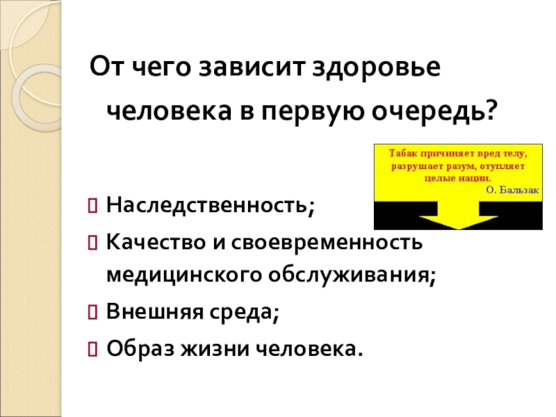 Слайд 9От чего зависит здоровье человека в первую очередь?