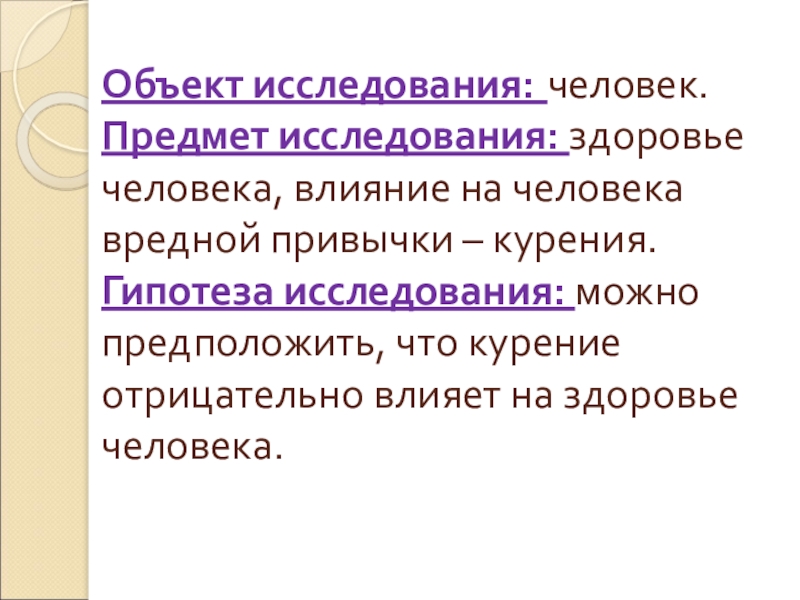 Предмет исследования: здоровье человека, влияние на человека вредной привычки