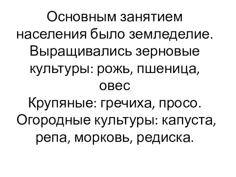 Слайд 9Основным занятием населения было земледелие. Выращивались зерновые культуры: рожь, пшеница, овес Крупяные: