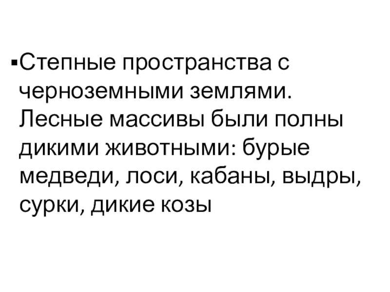 Слайд 6Степные пространства с черноземными землями. Лесные массивы были полны дикими животными: бурые