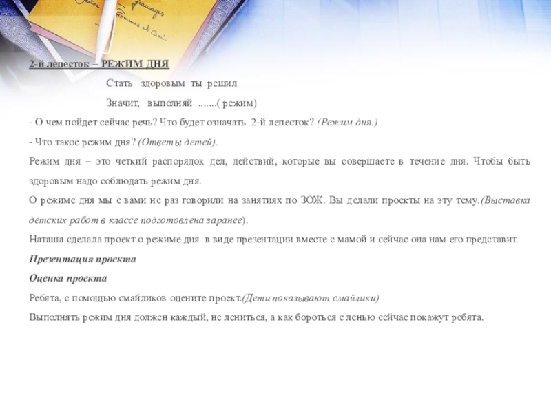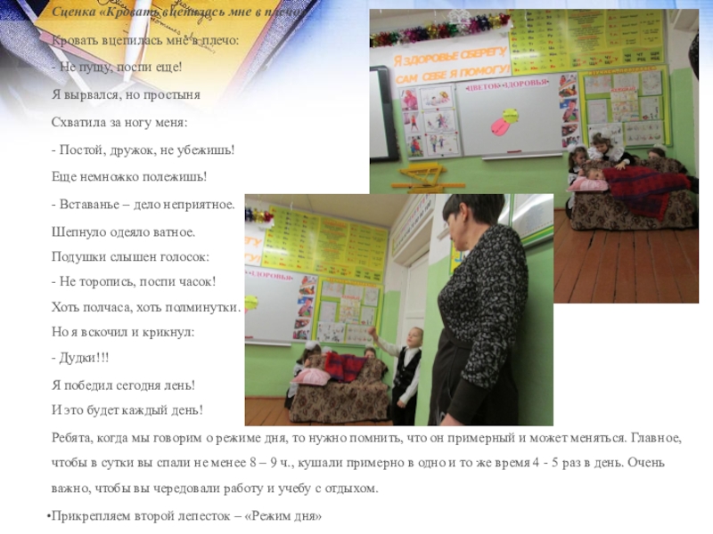 - О чем пойдет сейчас речь? Что будет означать 2-й лепесток? (Режим дня.)