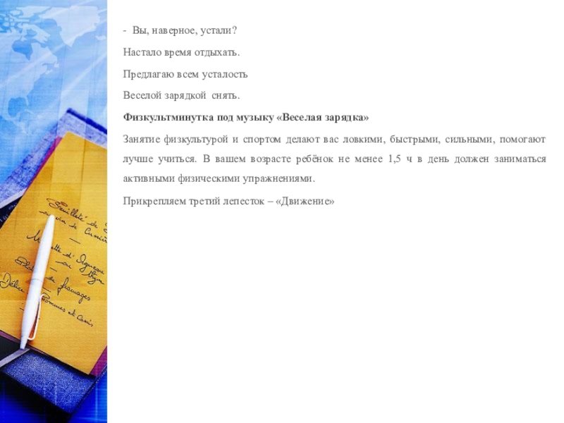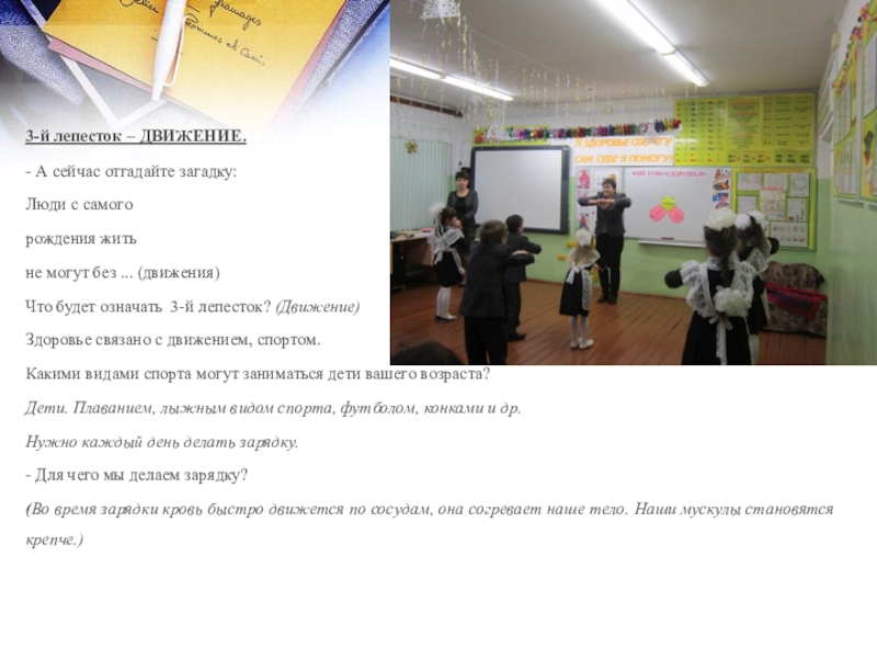 таким замечательным, если бы мы прикасались только к одному из его лепестков. Цветок красив только тогда, когда все его лепестки живы и полны радости оттого, что могут подсказать мальчикам и девочкам, о том, как заботиться о своем здоровье. Наш цветок волшебный, потому что дарит здоровье всем окружающим.