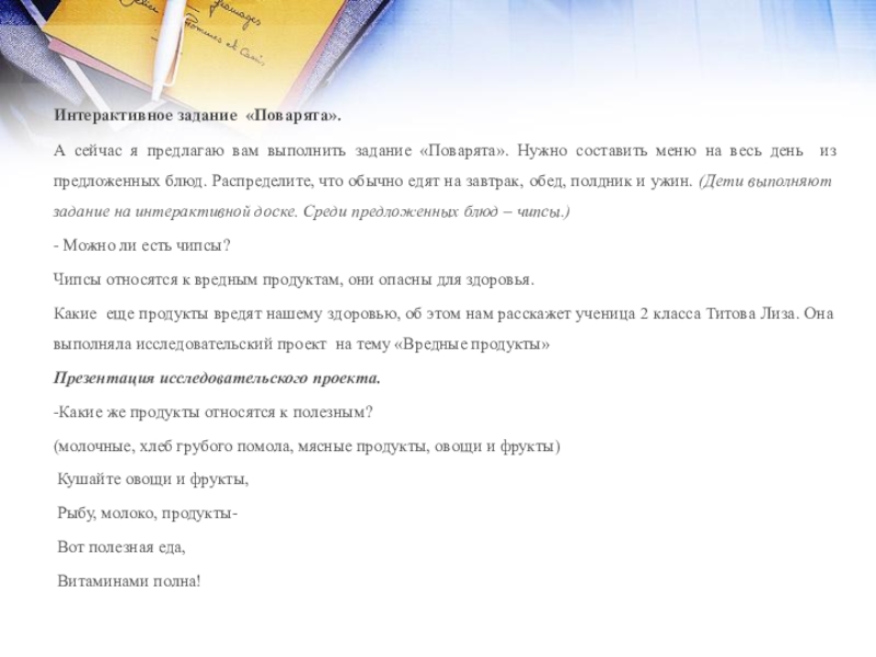 О режиме дня мы с вами не раз говорили на занятиях по ЗОЖ. Вы делали проекты на эту тему.(Выставка детских работ в классе подготовлена заранее).