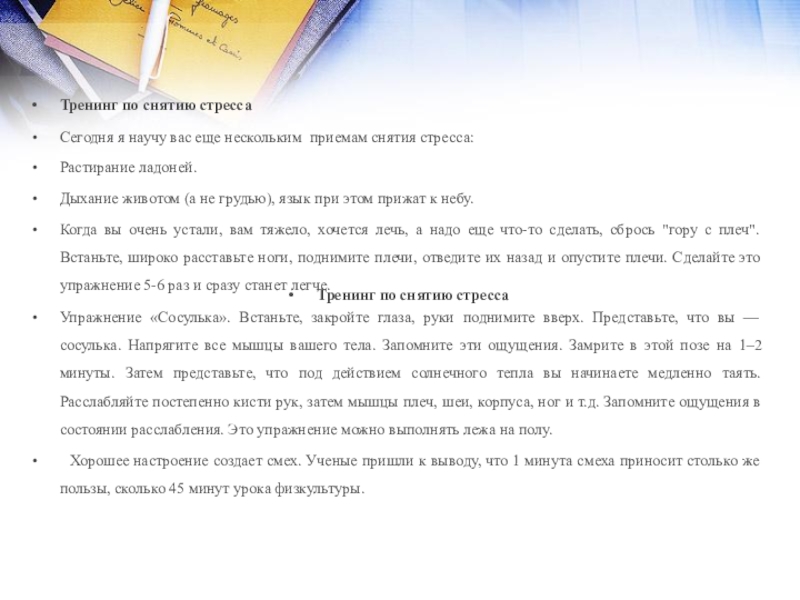 Упражнение «Сосулька». Встаньте, закройте глаза, руки поднимите вверх. Представьте, что вы — сосулька. Напрягите все мышцы вашего тела. Запомните эти ощущения. Замрите в этой позе на 1–2 минуты. Затем представьте, что под действием солнечного тепла вы начинаете медленно таять. Расслабляйте постепенно кисти рук, затем мышцы плеч, шеи, корпуса, ног и т.д. Запомните ощущения в состоянии расслабления. Это упражнение можно выполнять лежа на полу.