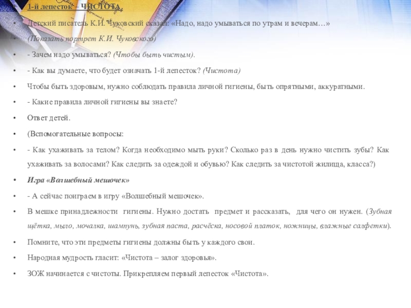- Как вы думаете, что будет означать 1-й лепесток? (Чистота)