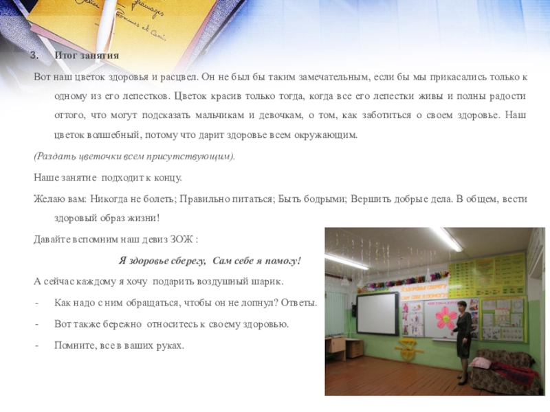 как следует себя вести, чтобы сохранить здоровье. По ходу занятия создадим цветок здоровья, каждый лепесток которого содержит в себе правила ЗОЖ.