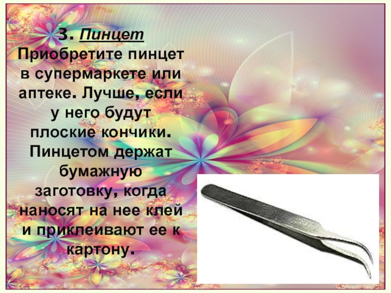 будут плоские кончики. Пинцетом держат бумажную заготовку, когда наносят на нее клей и приклеивают ее к картону.