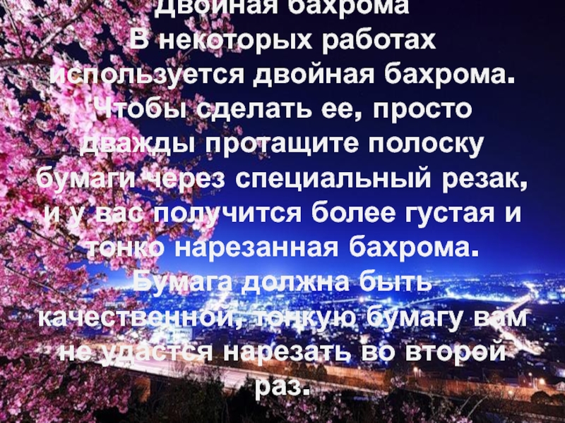 дважды протащите полоску бумаги через специальный резак, и у вас получится более густая и тонко нарезанная бахрома. Бумага должна быть качественной, тонкую бумагу вам не удастся нарезать во второй раз.