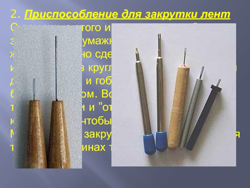 бумажные спирали. При желании можно сделать простейший инструмент из круглой деревянной палочки длиной 10 см и гобеленовой иглы с большим ушком. Воткните острие иглы в торец палочки и "откусите" кусачками кончик ушка, чтобы осталась щель.