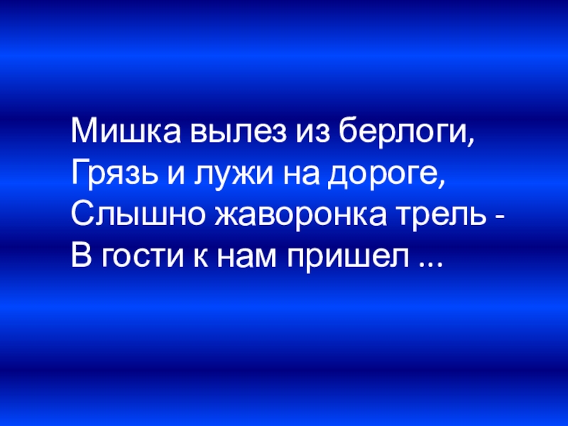 Слайд 6Мишка вылез из берлоги, Грязь и лужи на дороге, Слышно жаворонка трель - В