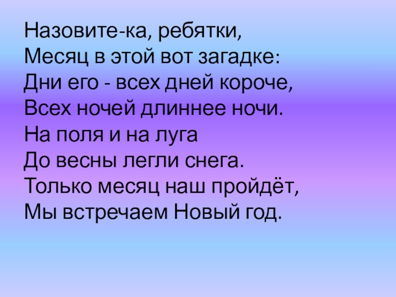 Назовите-ка, ребятки, Месяц в этой вот загадке: Дни его - всех дней короче, Всех ночей длиннее ночи.