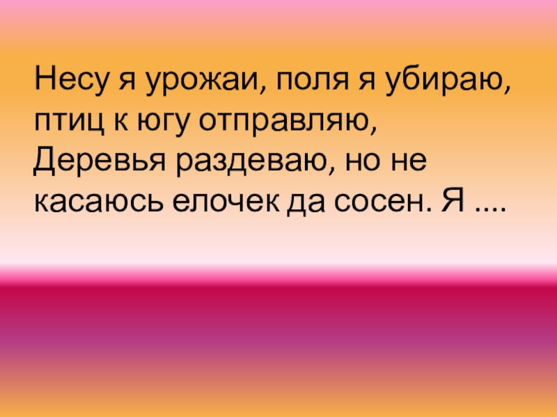Слайд 20Несу я урожаи, поля я убираю, птиц к югу отправляю, Деревья раздеваю,