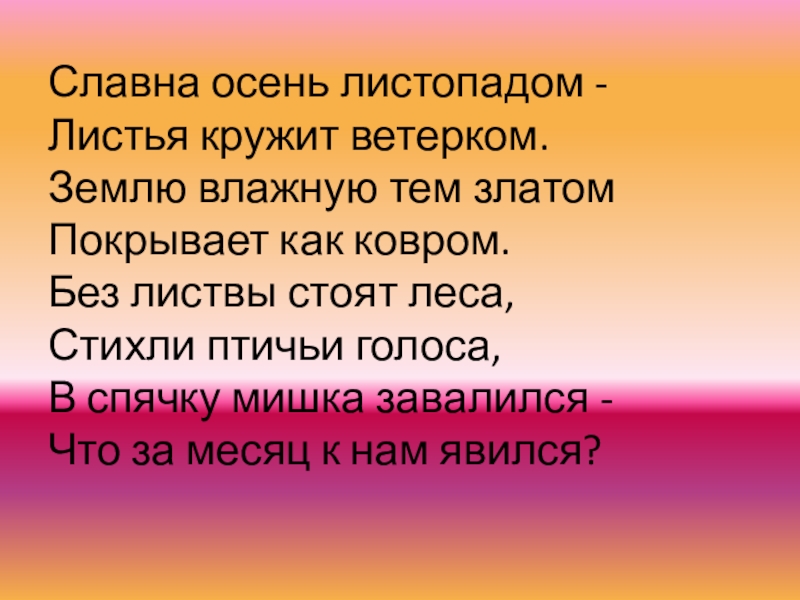 листвы стоят леса, Стихли птичьи голоса, В спячку мишка завалился - Что за месяц к нам явился?