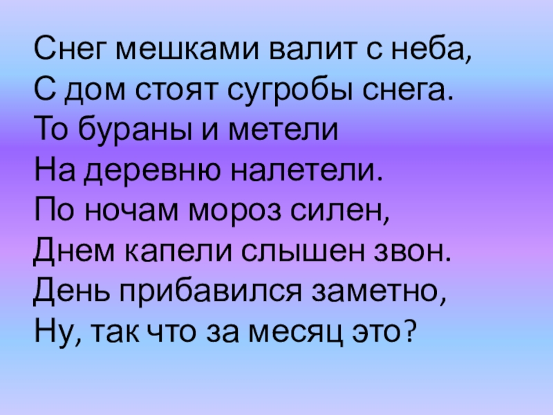 метели На деревню налетели. По ночам мороз силен, Днем капели слышен звон. День прибавился заметно, Ну, так что за месяц это?