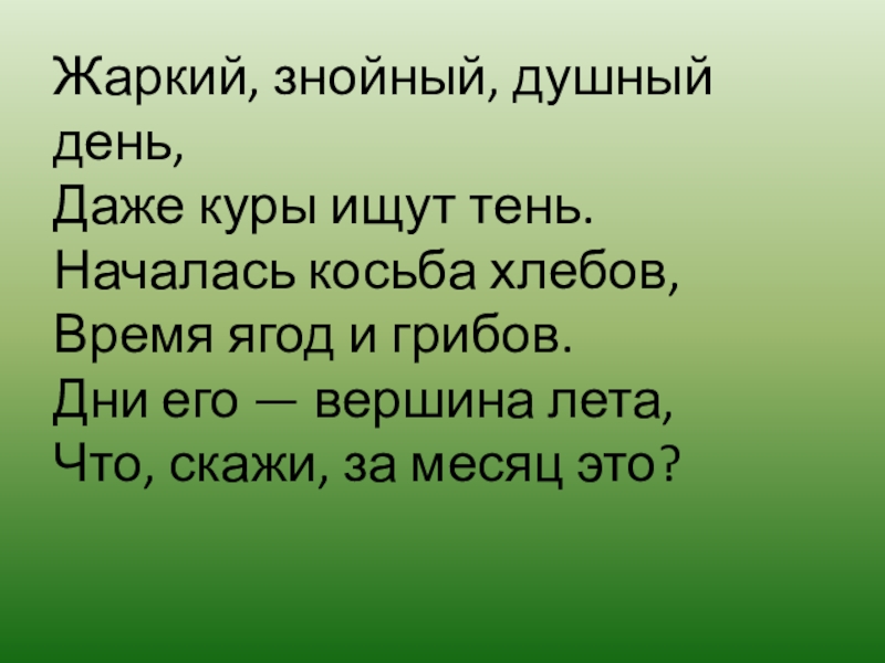 Жаркий, знойный, душный день,  Даже куры ищут тень.  Началась косьба хлебов,  Время ягод и грибов.  Дни его