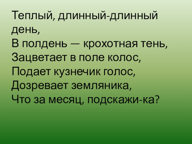 Теплый, длинный-длинный день,  В полдень — крохотная тень,  Зацветает в поле колос,  Подает кузнечик голос,  Дозревает земляника,