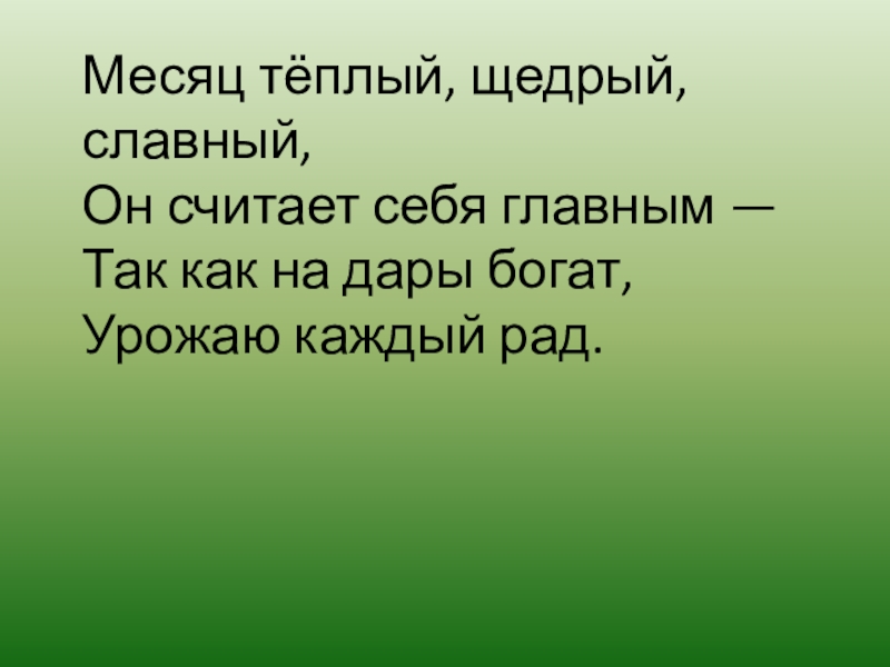 Месяц тёплый, щедрый, славный, Он считает себя главным — Так как на дары богат, Урожаю каждый рад.