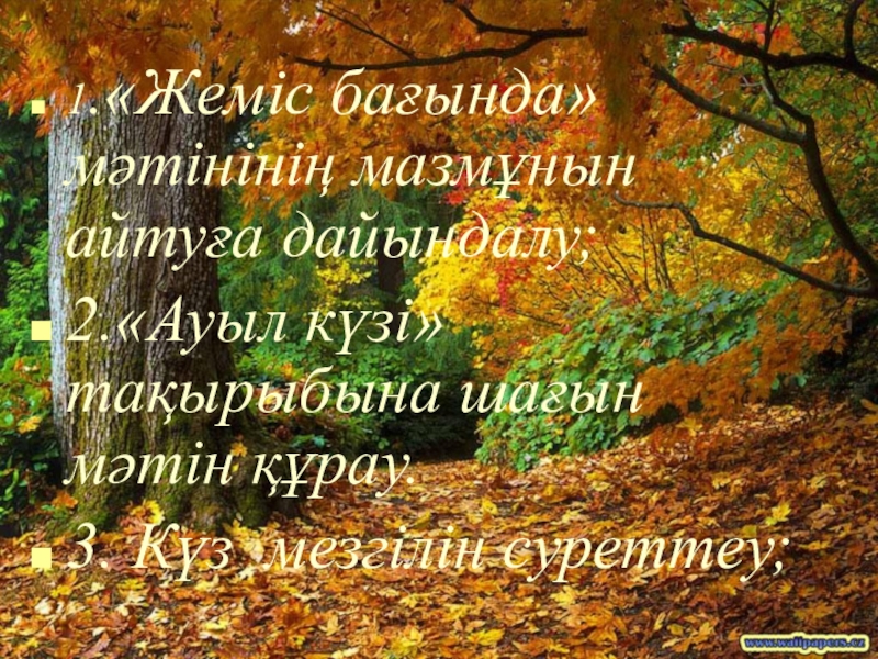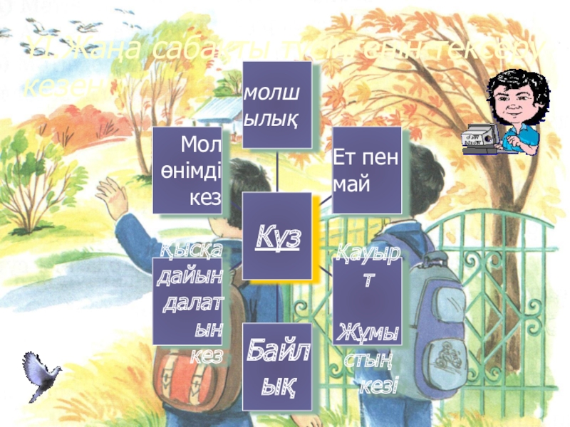 ІІ. Үй тапсырмасын сұрау:1.«Жеміс бағында» мәтінінің мазмұнын айтуға дайындалу;2.«Ауыл күзі» тақырыбына шағын мәтін құрау.3. Күз мезгілін