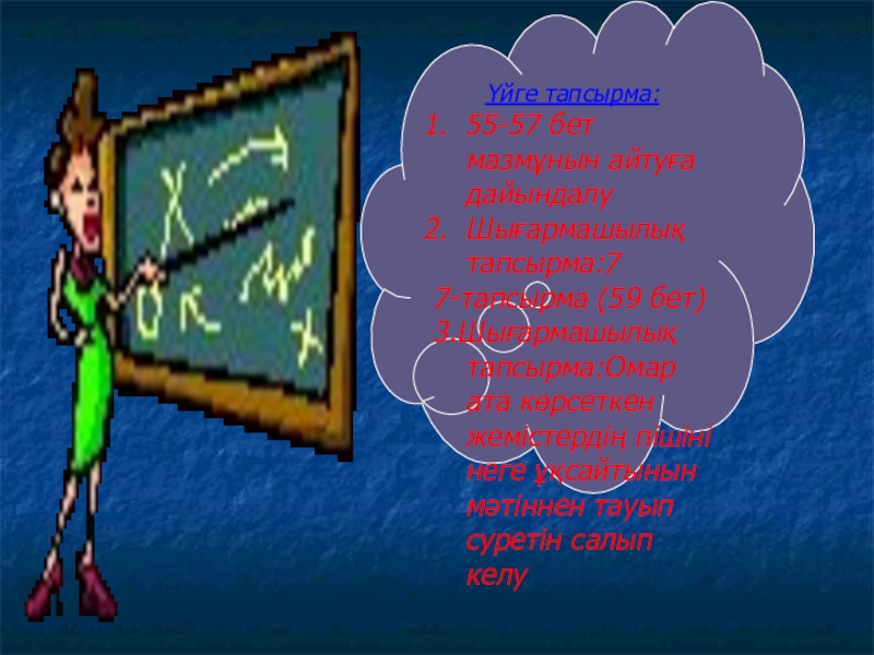 Үйге тапсырма:55-57 бет мазмұнын айтуға дайындалуШығармашылық тапсырма:77-тапсырма (59 бет)3.Шығармашылық тапсырма:Омар ата көрсеткен жемістердің пішіні неге ұқсайтынын мәтіннен