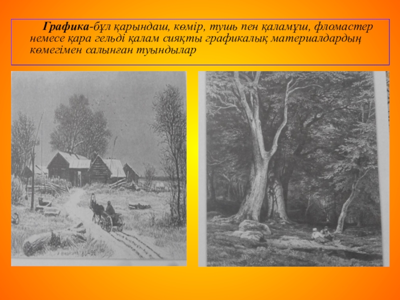 Графика-бұл қарындаш, көмір, тушь пен қаламұш, фломастер немесе қара гельді қалам сияқты графикалық материалдардың көмегімен салынған туындылар