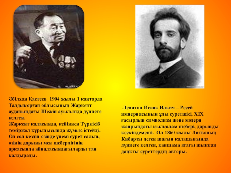 Левитан Исаак Ильич – Ресей империясының ұлы суретшісі, XIX ғасырдың символизм және модерн жанрындағы қылқалам шебері, дарынды кескіндемеші. Ол 1860 жылы Литваның Кибарты деген шағын қалашығында дүниеге келген, қаншама атағы шыққан даңқты суреттердің авторы.