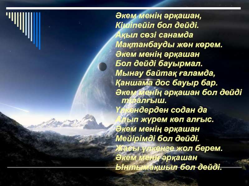 Әкем менің әрқашан, Кішіпейіл бол дейді.Ақыл сөзі санамдаМақтанбауды жөн көрем.Әкем менің әрқашанБол дейді бауырмал.Мынау байтақ ғаламда,Қаншама дос
