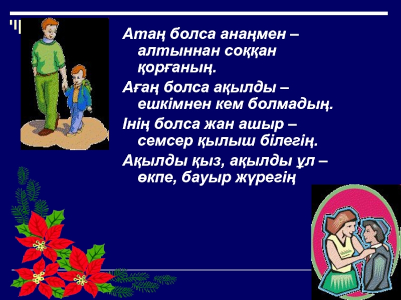 Слайд 9Атаң болса анаңмен – алтыннан соққан қорғаның.