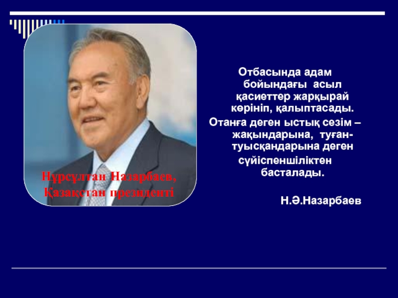Отбасында адам бойындағы асыл қасиеттер жарқырай көрініп, қалыптасады.Отанға деген ыстық сезім – жақындарына, туған-туысқандарына деген сүйіспеншіліктен басталады.Н.Ә.Назарбаев