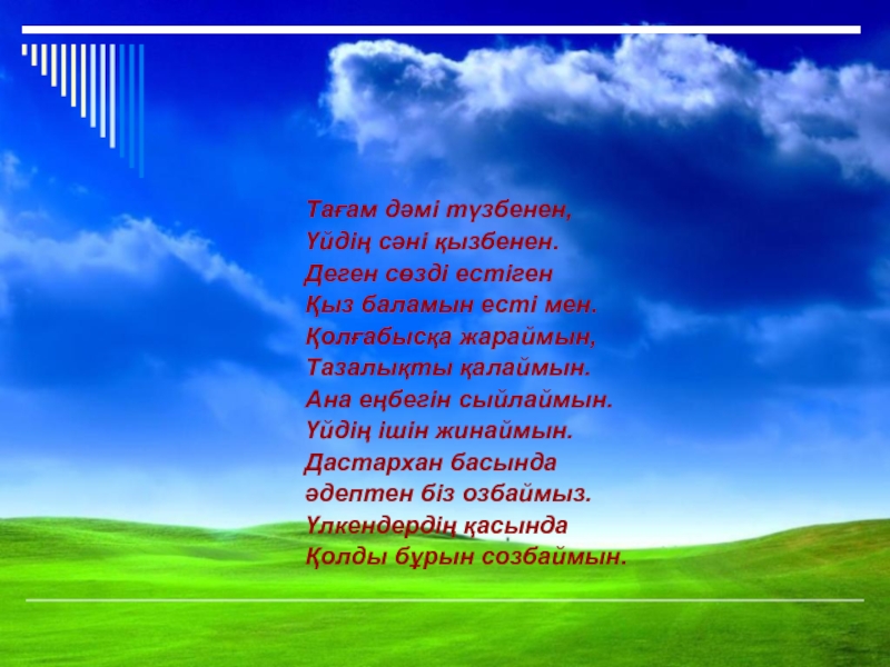 Тағам дәмі түзбенен,Үйдің сәні қызбенен.Деген сөзді естігенҚыз баламын есті мен.Қолғабысқа жараймын,Тазалықты қалаймын.Ана еңбегін сыйлаймын.Үйдің ішін жинаймын.Дастархан басындаәдептен