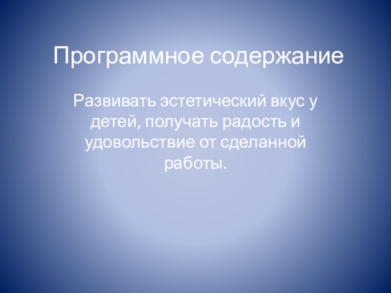 Программное содержаниеРазвивать эстетический вкус у детей, получать радость и удовольствие от сделанной работы.