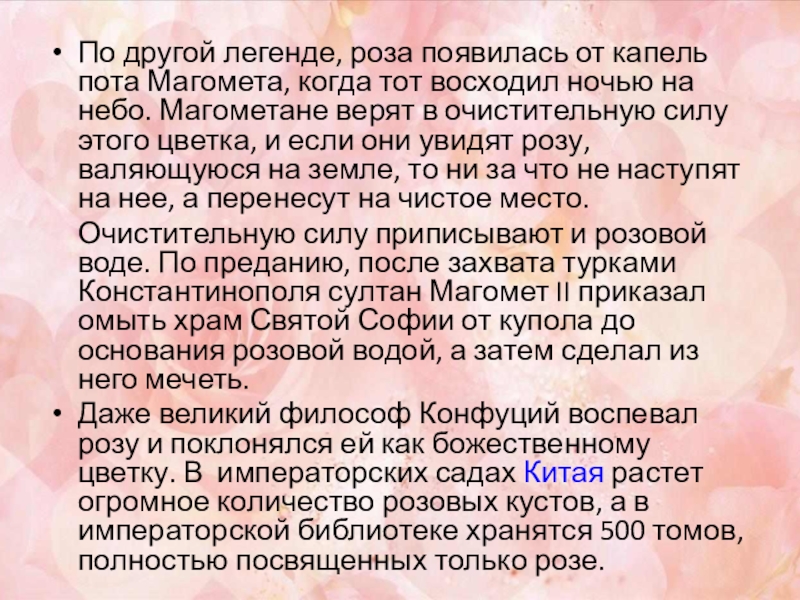 Слайд 6По другой легенде, роза появилась от капель пота Магомета, когда тот